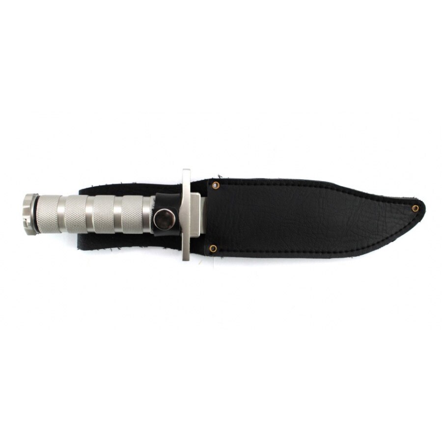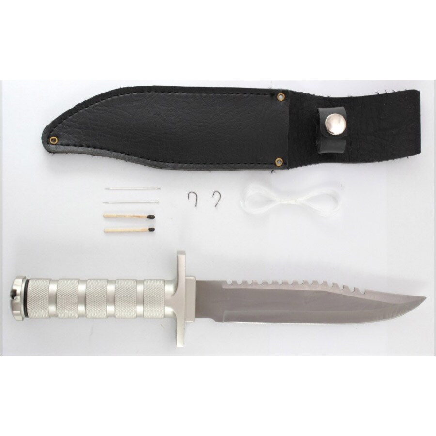Velik in masiven survival nož iz zelo odpornega nerjavečega jekla z najnujnejšim orodjem za preživetje.