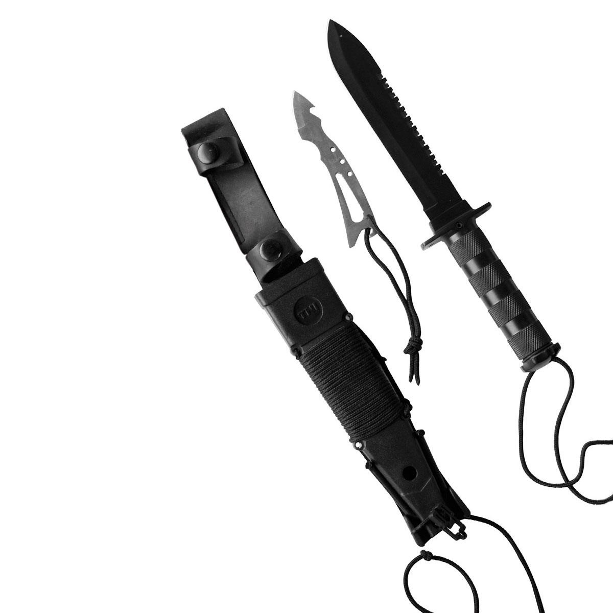 Nož za preživetje z vrsto dodatnih funkcij in priloženih orodij, ki vam bodo pomagali v številnih priložnostih. Nazobčana stran rezila služi kot žaga. Ročaj je izdelan iz cinkove zlitine.